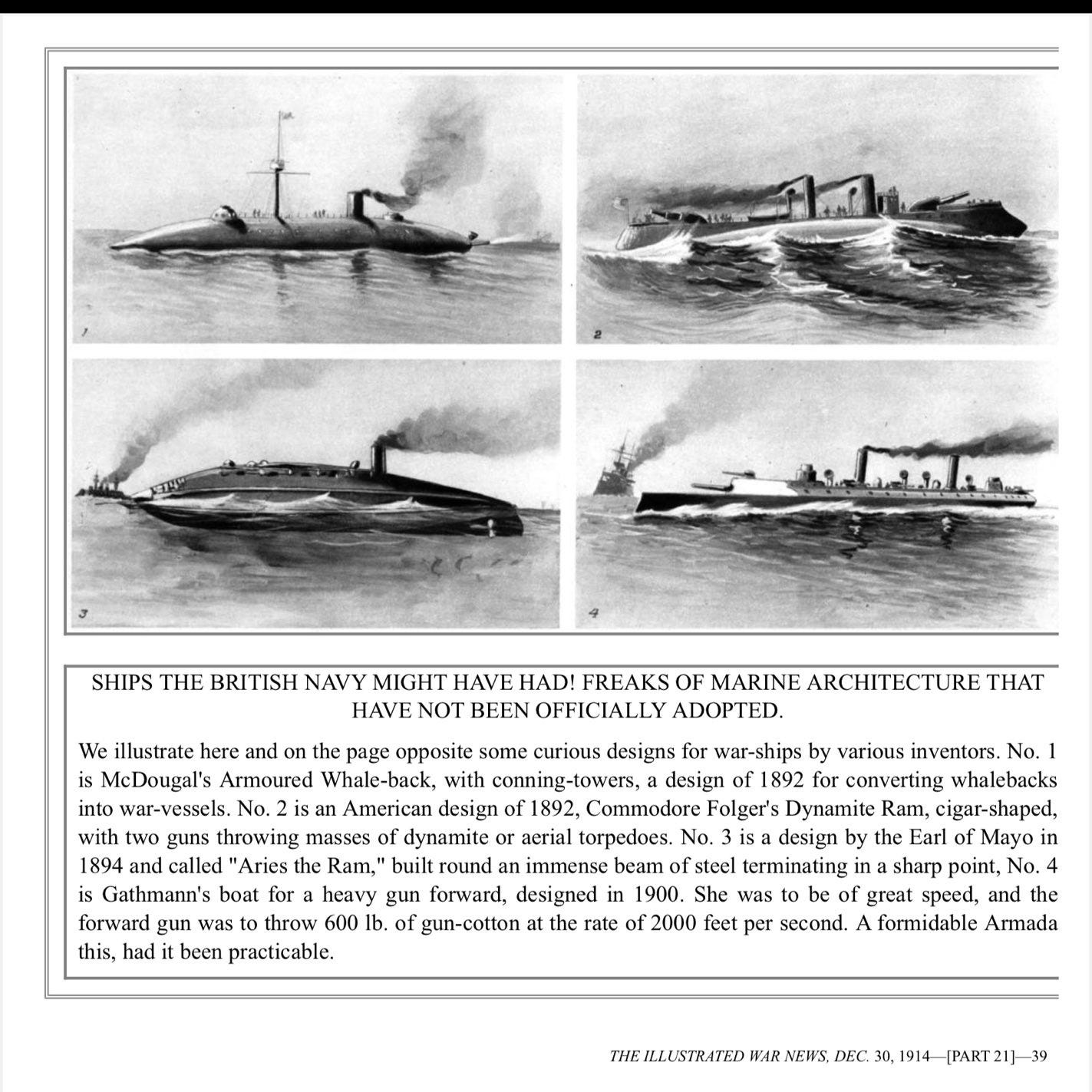 At the outbreak of World War I, a British propaganda magazine called Illustrated War News was launched. The premise of this magazine was to create visual reporting of WWI from an allied perspective, with strong pro-British propaganda elements running through. Flicking through the pages, the reader arrives at a section titled “FREAKS OF MARINE ARCHITECTURE THAT HAVE NOT BEEN OFFICIALLY ADOPTED?” which includes several designs, shown above.